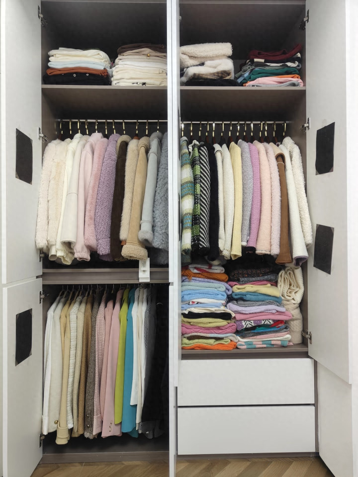 第三点:卫衣、毛衣折叠法,厚实也能装。厚衣服先把袖子向内折,再下摆向上折,整体对折成方块,不用卷太紧,避免变形。放在衣柜上层,大小统一,堆叠起来也不会倒,衣柜瞬间清爽整洁。